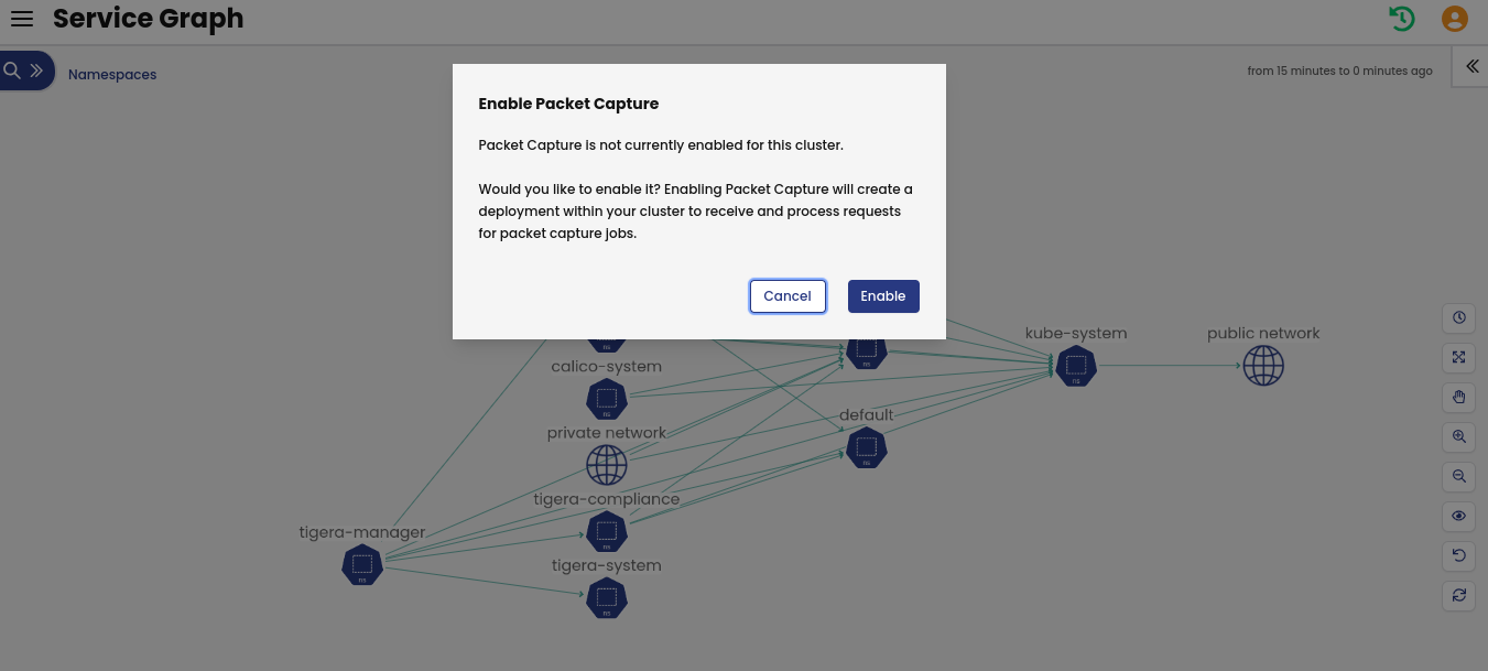 Calico Enterprise packet capture is implemented in a Kubernetes-native way so you can troubleshoot service/application connectivity issues and performance issues. You can start a packet capture in the web console Service Graph, or using the CLI.