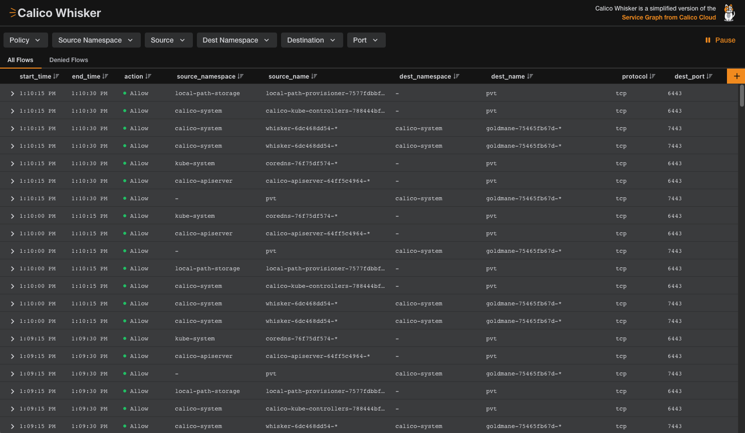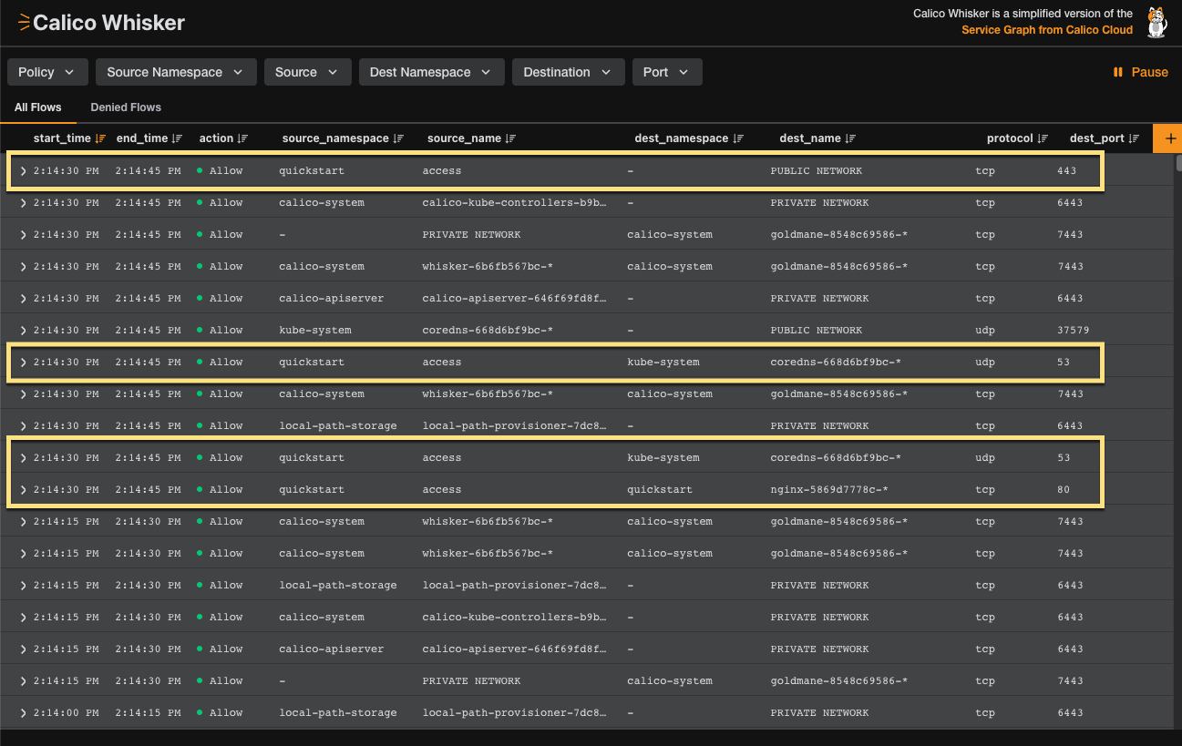 The web console accumulates flow logs in real time. Keep this window open through the rest of the tutorial to see logs of the connections your pods are making.
