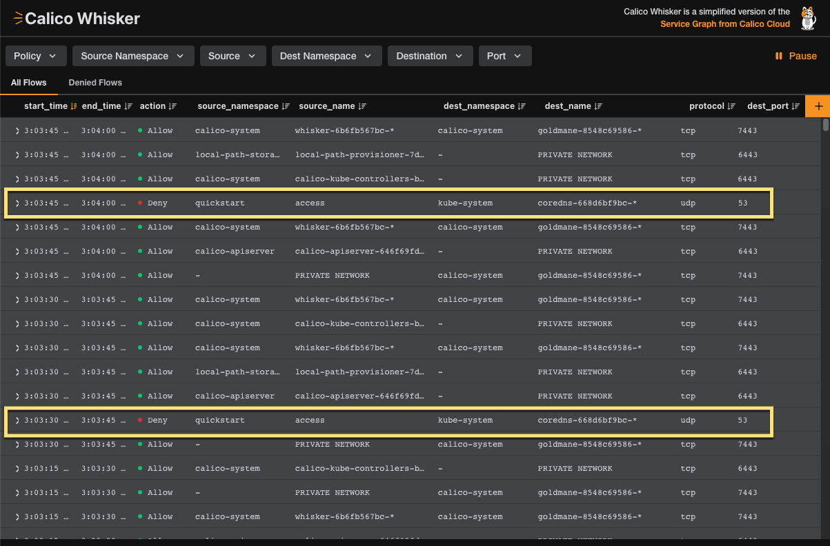 Return to your browser to see the denied flow logs appear in the Whisker web console. You should see two denied flows to